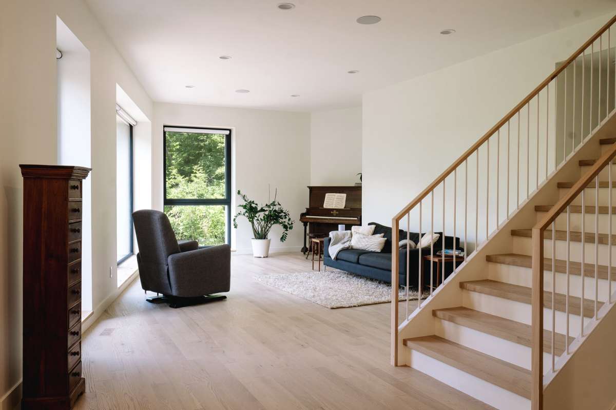 This Passive House is situated on a unique site, the product of converging streets and a bend in the River. The form of the house is the product of an optimization, and the desire for privacy. This family home celebrates its connection to the riverbed, providing visual connection form the interior space. Carefully situated on an urban infill lot, the home addresses the need for passive solar heating by biasing the house to the north side of the lot, and tweaks the orientation to maximize views to undeveloped forest and river.